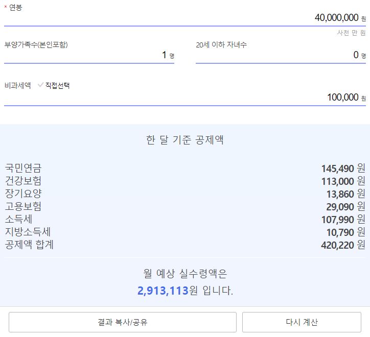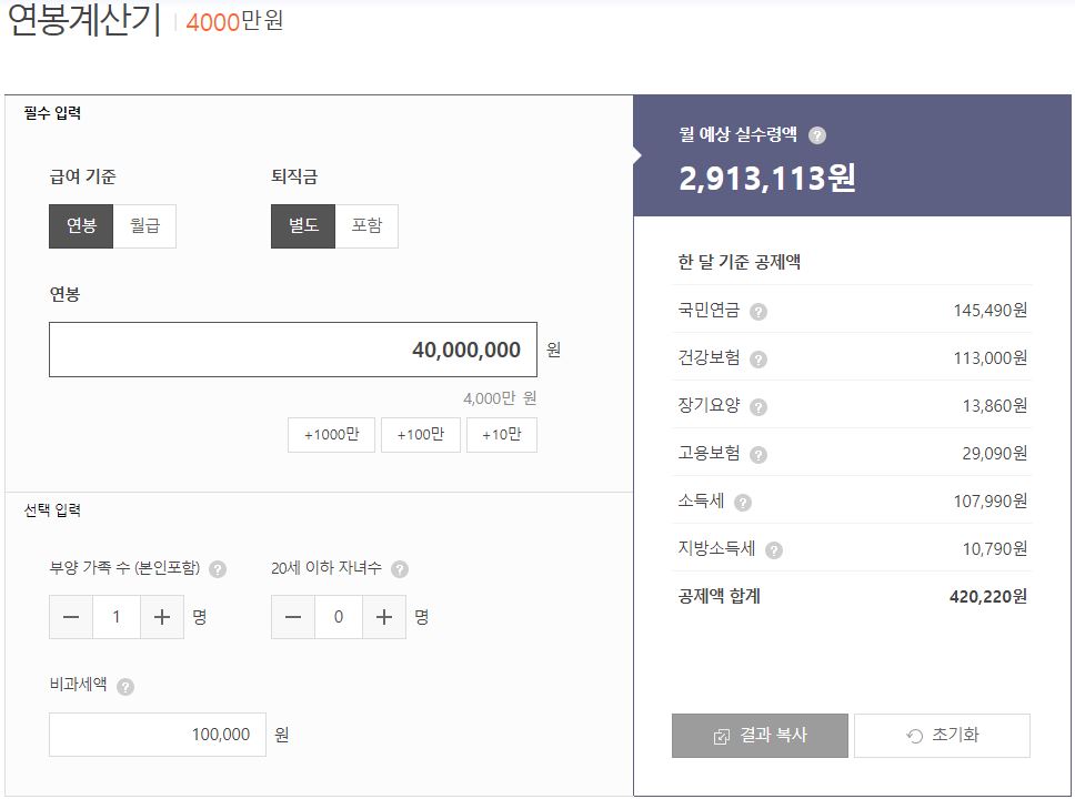 기본 설정은 급여기준-연봉, 퇴직금-별도, 부양가족수-1명(본인), 20세 이하 자녀수-0명, 비과세액-100,000원으로 되어 있습니다. 정확한 금액을 확인하고 싶으신분들은 본인의 조건에 맞게 입력하시면 되구요. 대략적인 금액을 바로 알고 싶으신 분들은 연봉 금액만 입력해보면 바로 월 예상 실수령액을 확인할 수 있습니다.(위 캡처 이미지 참조)