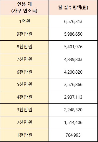 이렇게 해보니 공제액이 상당히 많은 듯 느껴지네요. 연봉1억이 넘는 분들은 계산해보니 월 실수령액이 660만원이 넘네요. 제가 미리 계산해본 표는 다음과 같습니다.(부양가족 2인 기준)